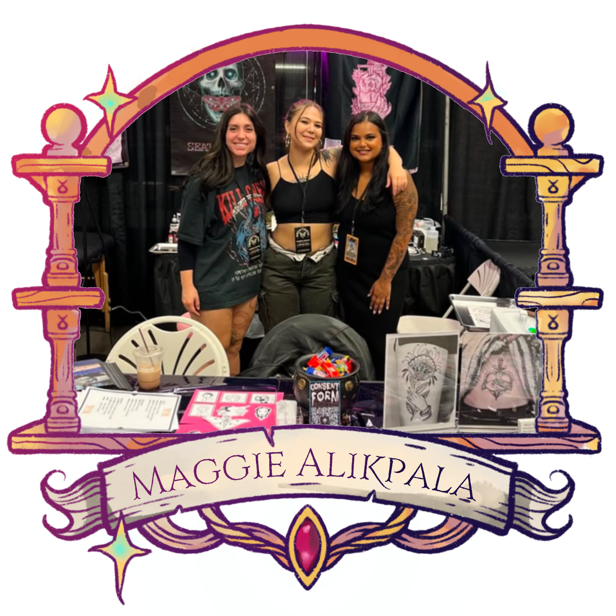 Maggie (she/her/they/them) specializes in neotraditional tattoos with art nouveau elements.